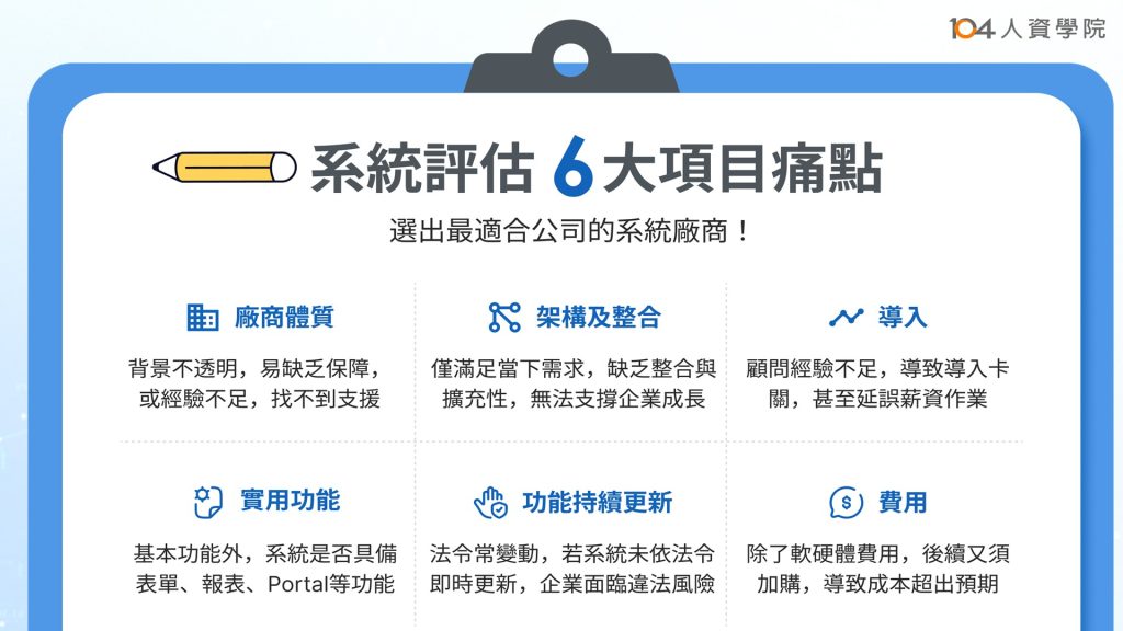 選擇HR系統時,大多中小企業常只關注功能介紹,卻忽略以下六大評估重點: