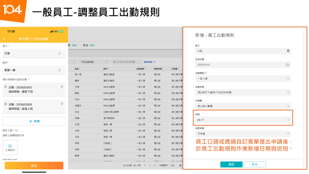 員工只需透過系統內建的「自訂表單」提出育兒減少工時計畫申請。主管與 HR 線上簽核後,HR 即可直接在系統的「出勤規則異動」中,為該員工新增專屬的日期與班別(如:將原本 09:00-18:00,設定為專屬的「09:00-17:00 育兒減少工時」班別)。