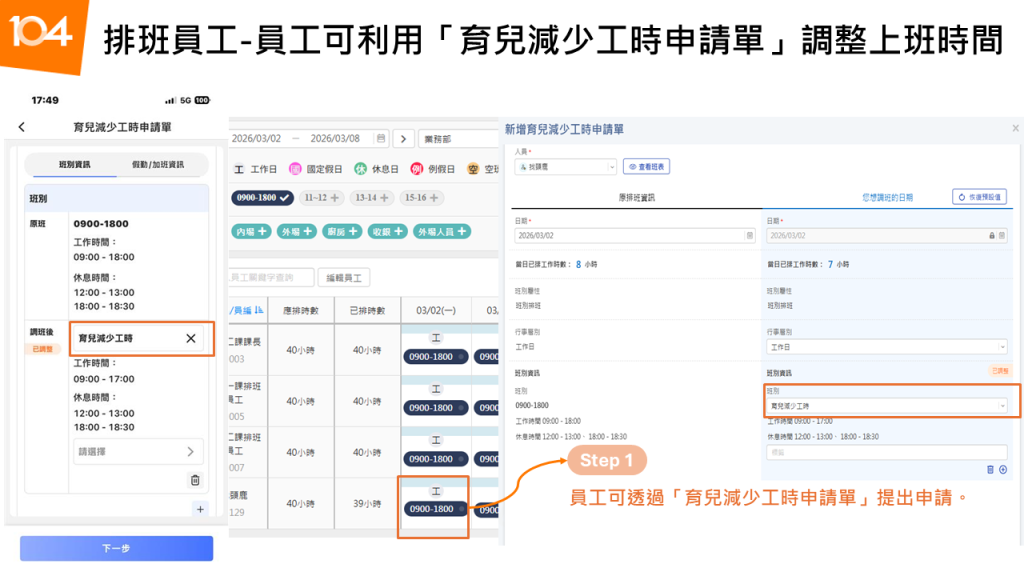 面對育兒減少工時或調整工作時間的繁雜行政作業,不需要增加 HR 的人力,只需要一套聰明的系統!104 人資系統已經準備好完整的應對方案,無論是固定班還是排班制員工,都能輕鬆處理: