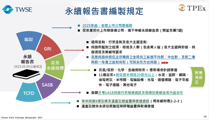 - 編制對象:自2025年起,所有於證券交易所及櫃買中心掛牌之公司,皆須發布永續報告書。