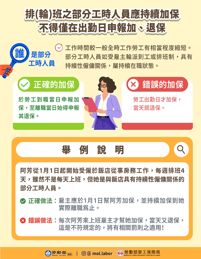 讓我們看看勞動部的實際案例:阿芳自1月1日起受僱於某飯店擔任房務人員,每週依飯店安排排班4天。雖然阿芳不是每天上班,但雇主持續排班指派工作,雙方持續具有僱傭關係。依規定,雇主應該從阿芳到職當日(1月1日)就申報加保,並持續投保到她實際離職為止。