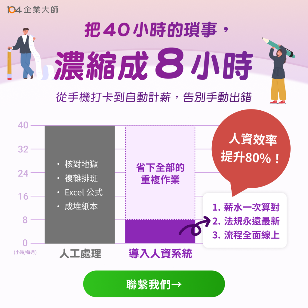 目前104企業大師提供免費試用三個月,百人以上企業推薦 HR MAX 人資系統,讓你的打卡、請假、加班及工資流程都合法,歡迎點入連結詢問專員>>立即了解