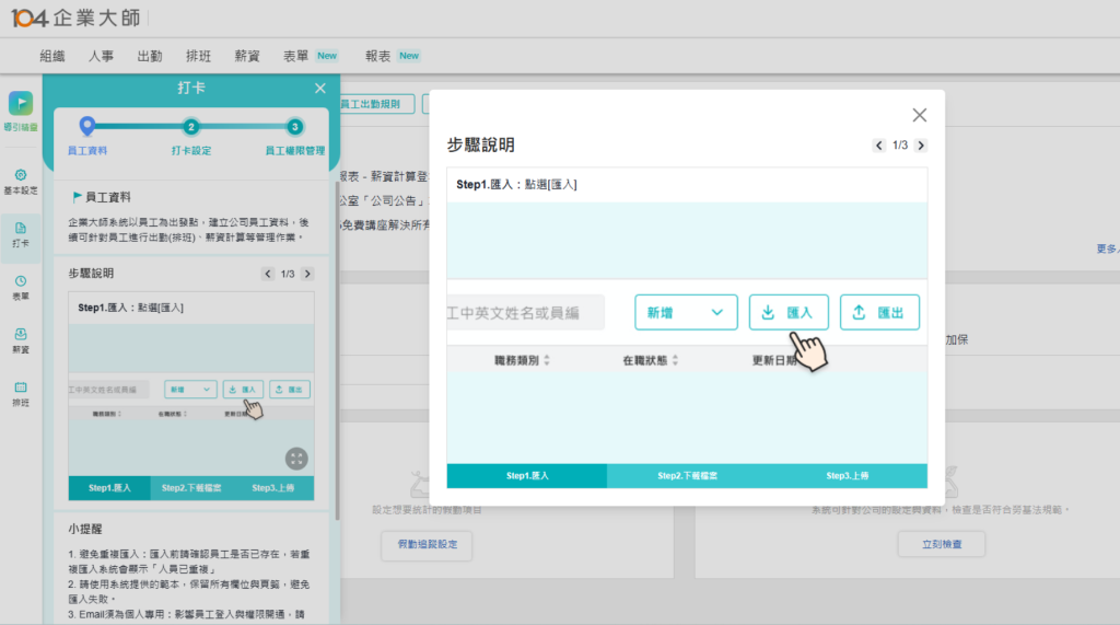 想到要建幾百個員工資料就手軟?別擔心,系統提供標準 Excel 範本。只要把現有資料貼上去,用批次匯入功能,幾分鐘就能建好所有人的檔案跟保險設定。系統還會自動檢查格式,不怕打錯字。如果是新進員工,還能直接匯入 104 求職網的履歷,從報到到算薪水一次完成。