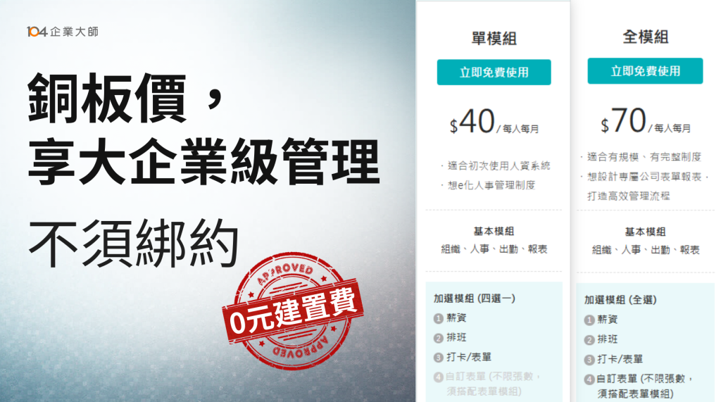 擔心買了系統不會用?104 直接提供 0 元建置費 與 3 個月免費導入體驗。這段期間所有功能全開,建議直接用真實資料進去試算一次薪水、跑一次排班。透過實際操作,確認系統真的符合需求,再付費。這種「先體驗、再買單」的策略,讓企業在數位轉型的路上完全零風險。