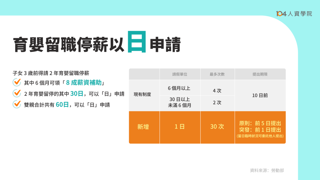亮點一:育嬰留停更彈性,開放「單日」申請