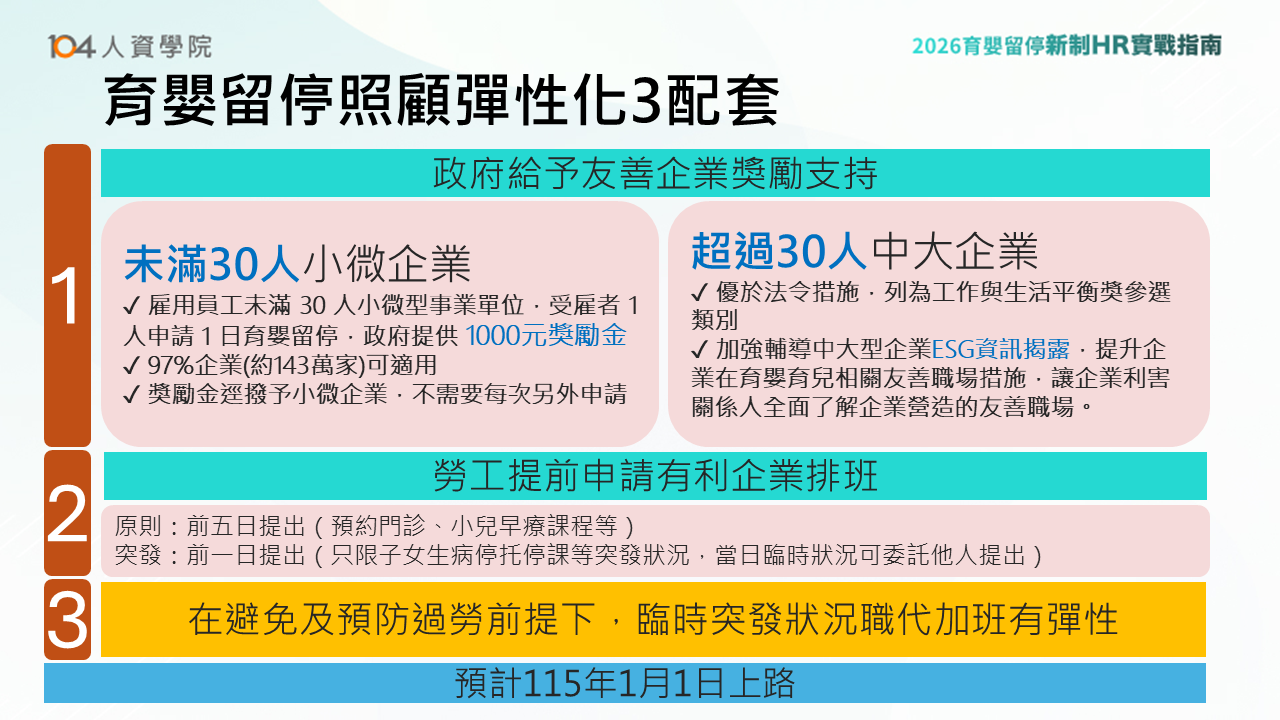 - 針對未滿30人的小微企業,當員工申請 1 日的彈性育嬰留停,政府提供雇主 1,000 元獎勵金,用於補貼代班人力成本。