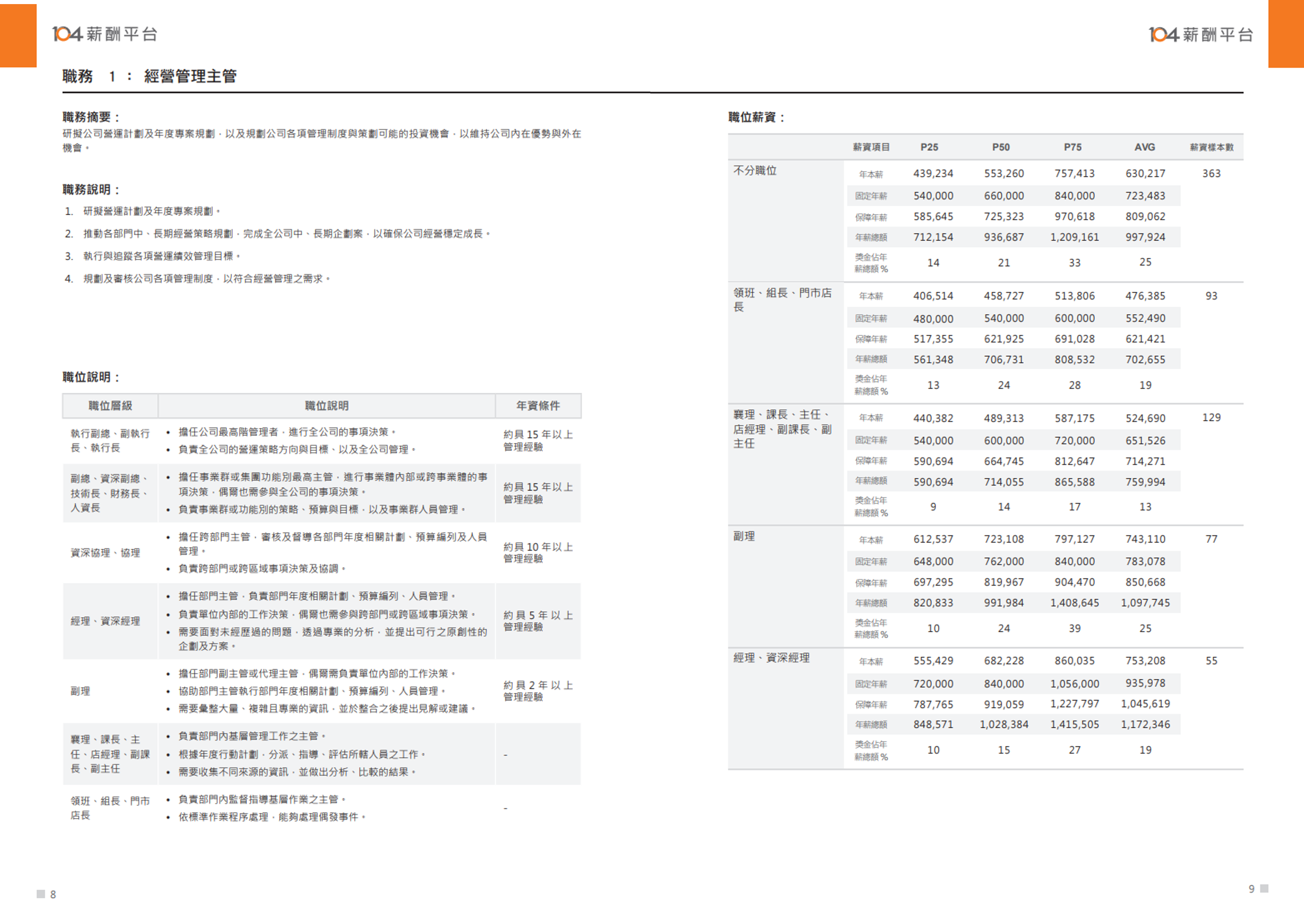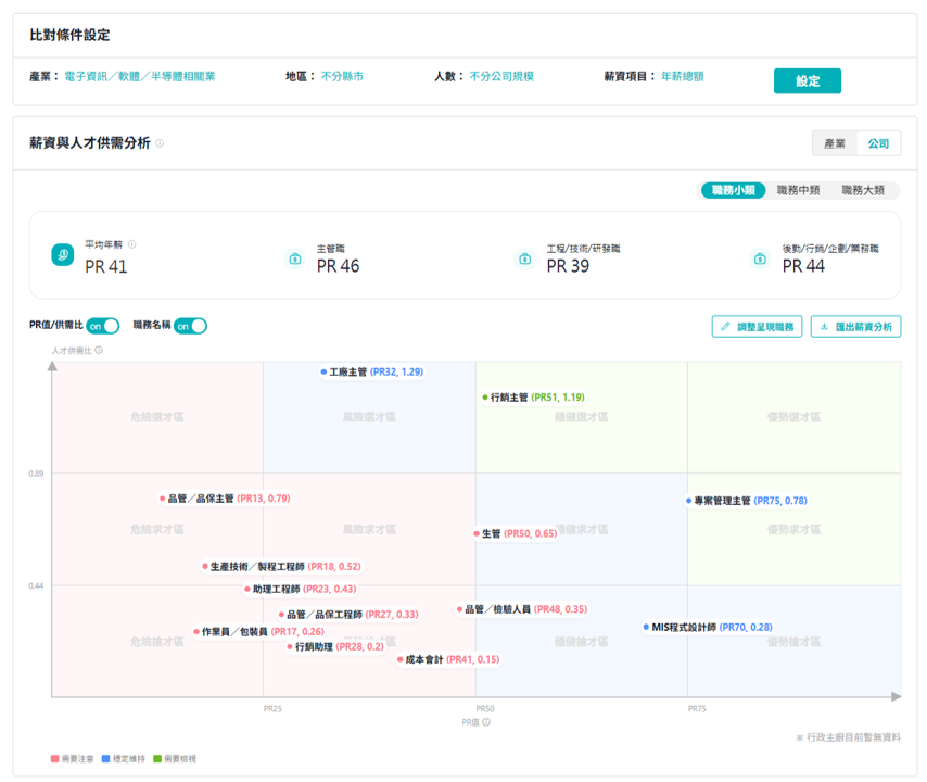 您可以透過「104薪資福利調查報告」中各職務之職位薪資,定位企業的薪資與策略。更進階應用「104薪酬平台」提供的「薪資儀表板」和「競業薪資」查詢功能。在對標市場診斷競爭力(PR值分析)的同時,亦了解市場人才供需狀況,實現「知己知彼,百戰不殆」的目標。企業主和人資夥伴可以隨時掌握外部競爭力,讓薪酬決策不再是黑箱作業。