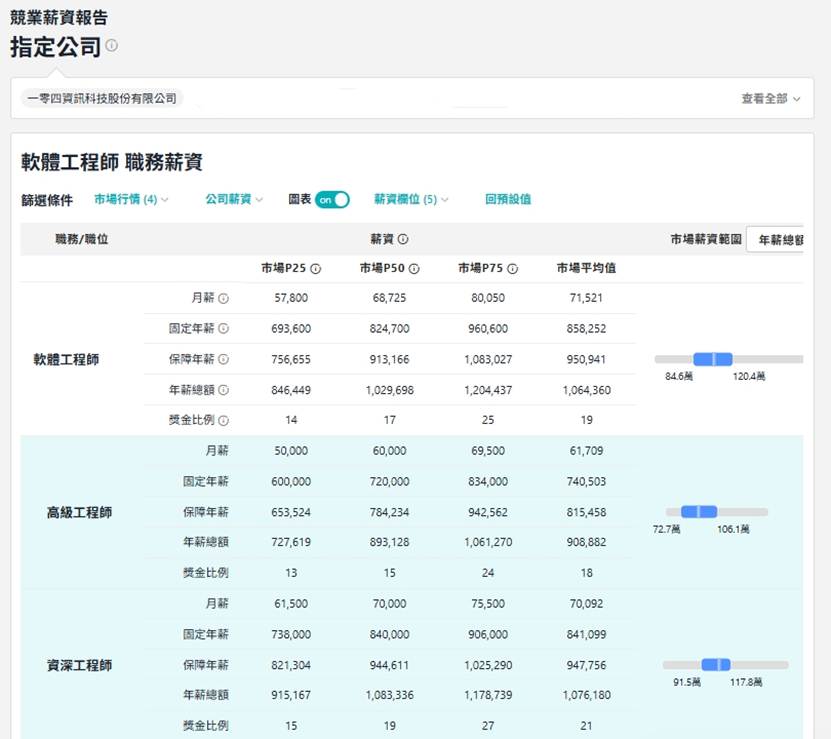 以下方薪資報告截圖中的軟體工程師為例,報告中細分了從「軟體工程師」、「高級工程師」到「資深工程師」的職等分布。您可以清楚看到各職等在市場上的「年薪總額範圍」以及「獎金比例」,這對企業在制定分級薪酬計畫或進行年度調薪時,提供了極其底氣十足的數據支撐。