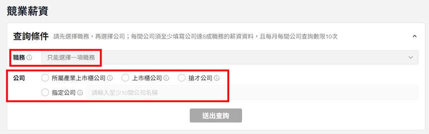 從下方系統截圖中可見,查詢條件清楚地區分了職務與公司選項。特別是在「指定公司」功能中,系統要求輸入至少10間公司,這不僅是為了保護單一企業的資料隱私,更能確保樣本分布具有統計上的參考性,避免被單一極端值誤導。