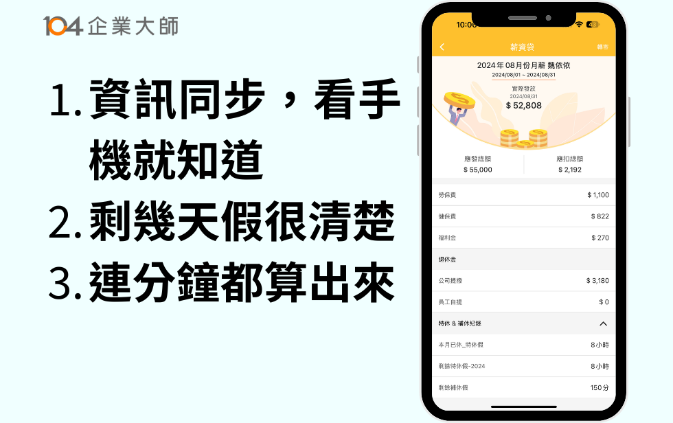 目前104企業大師提供免費試用三個月,百人以上企業推薦 HR MAX 人資系統,讓你的打卡、請假、加班及工資流程都合法,歡迎點入連結詢問專員>>立即了解