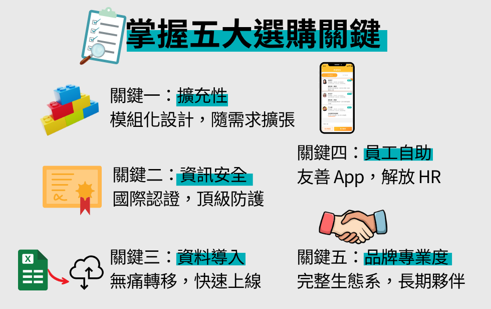 - 掌握標準:運用「擴充性、安全性、導入便利性、員工自助、品牌專業度」這五大關鍵,去檢視每一個潛在的選項。