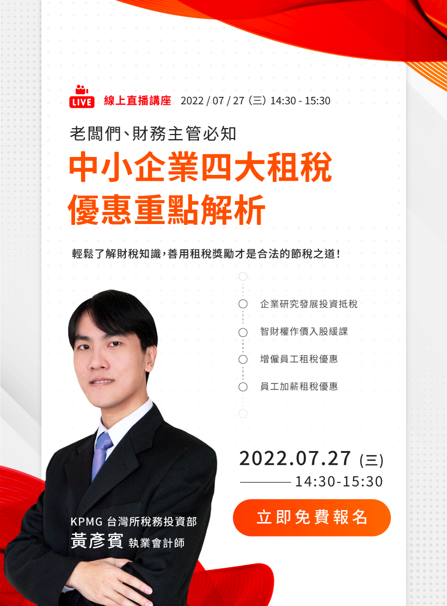 【免費講座】老闆們、財務主管必知-中小企業四大租稅優惠重點解析