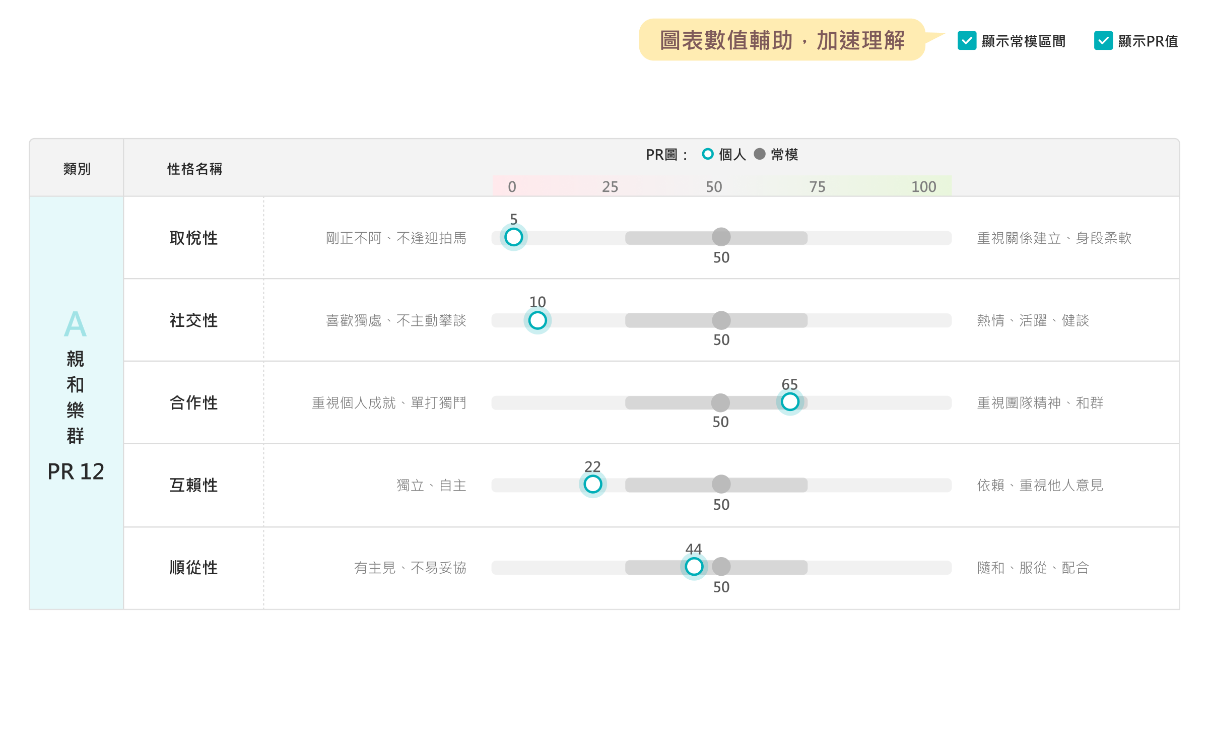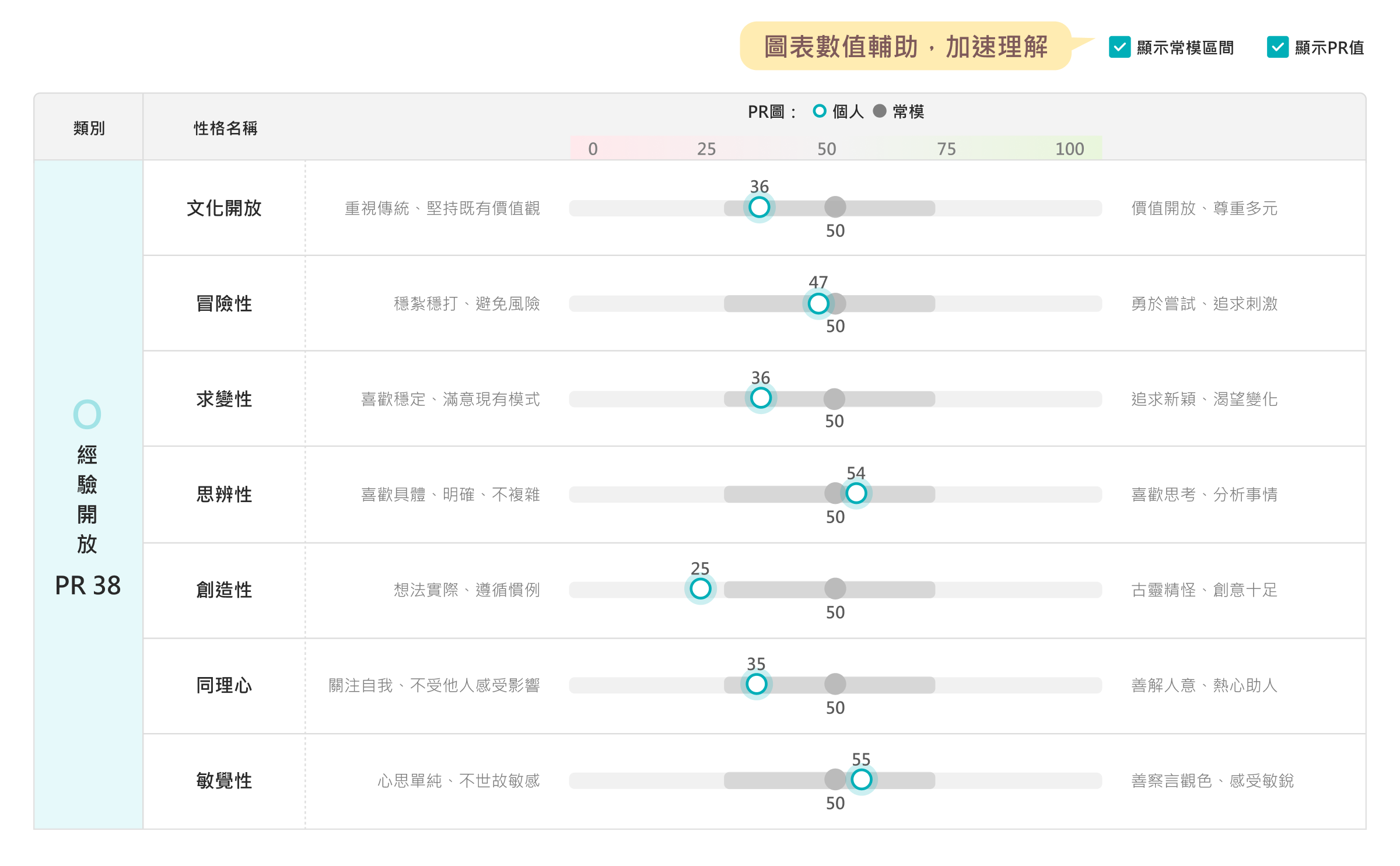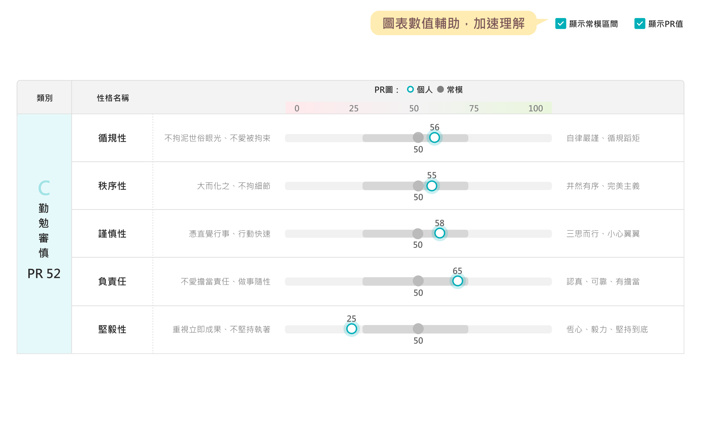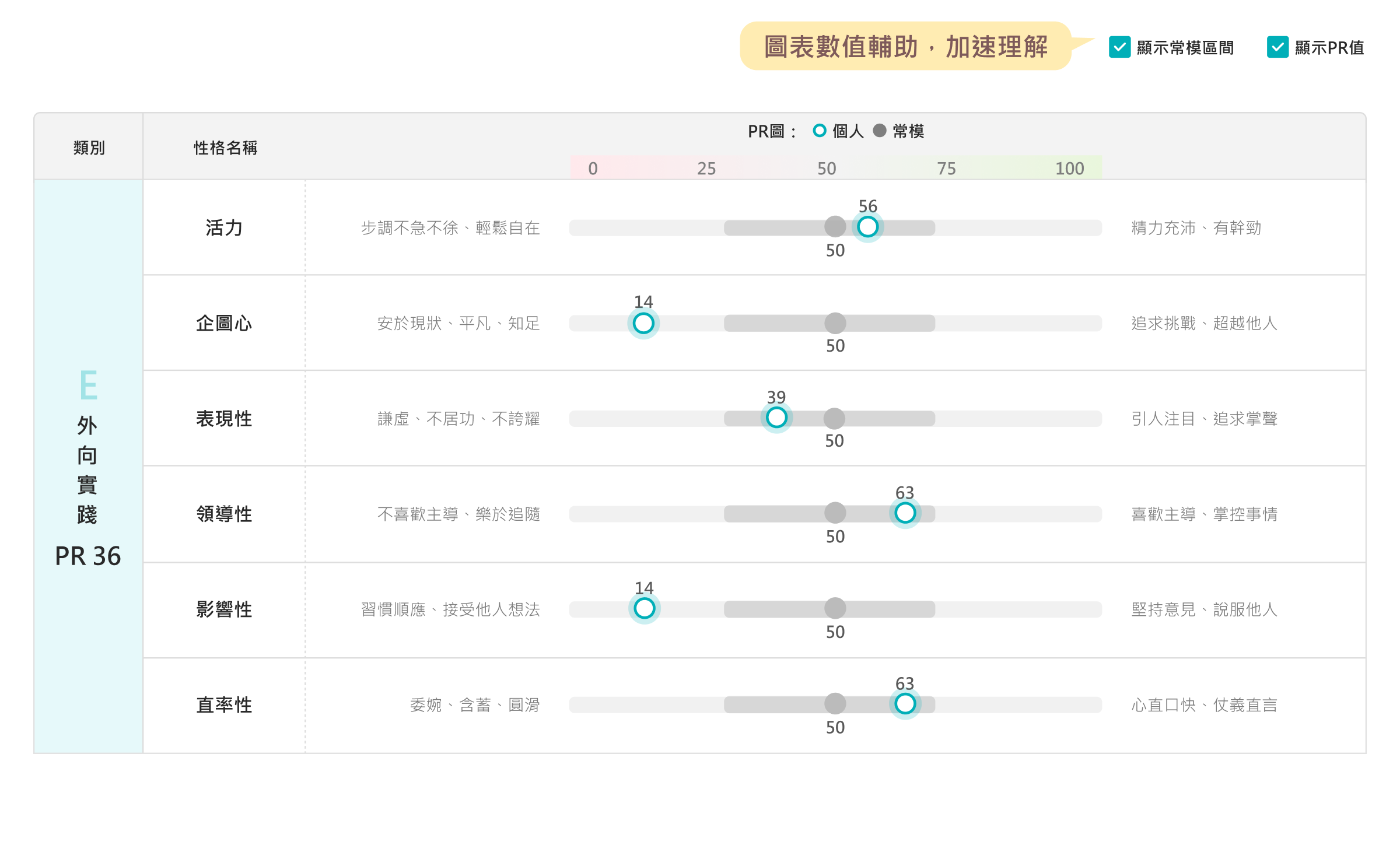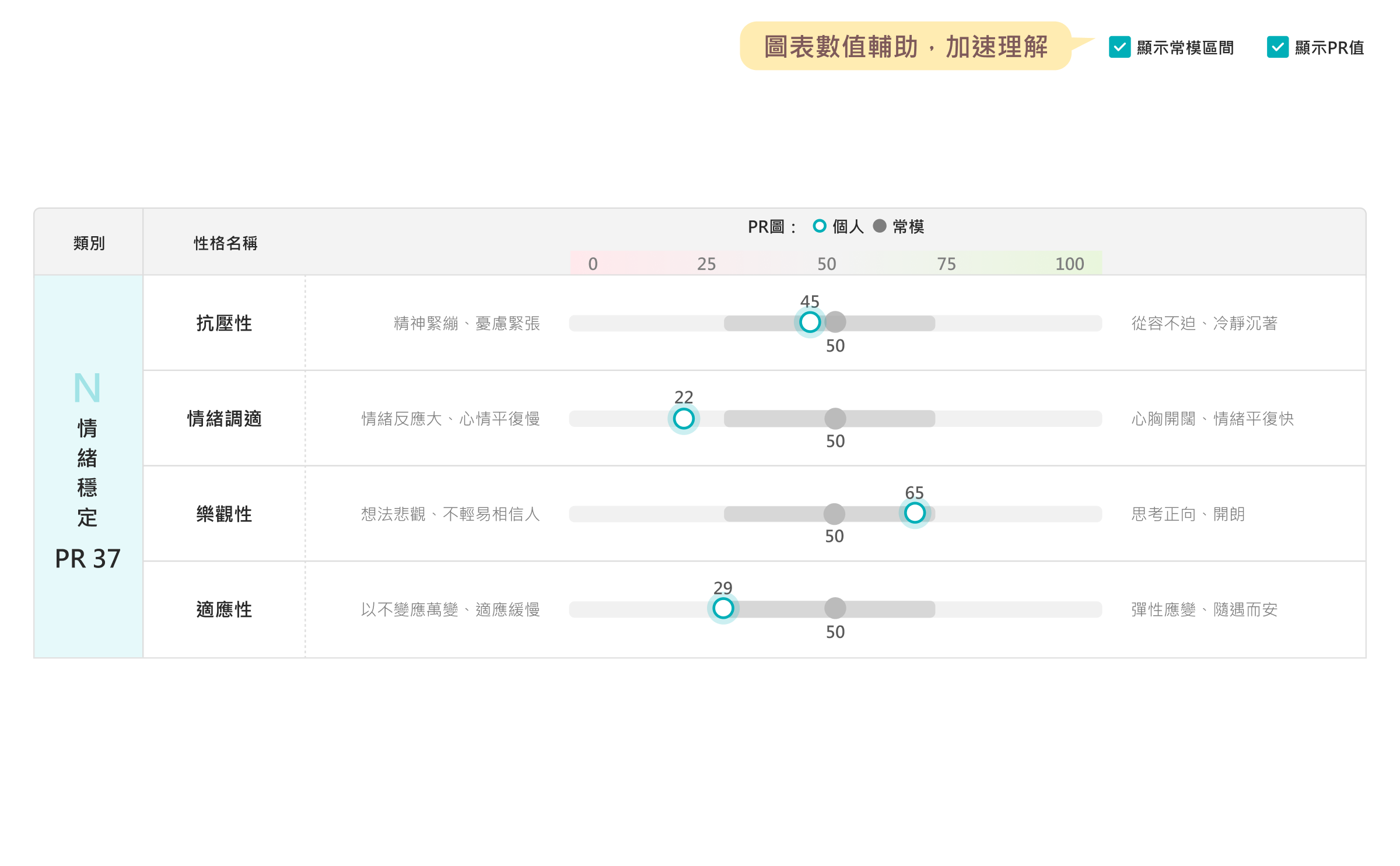採用心理學界普遍推崇之「五大人格因素」(Big Five Factors) 為架構,預測企業重視之各項職能(competencies) 為目標,經由預試、正試、信效度檢驗、常模建立等嚴謹過程編製而成,可有效描述受測者 27 項性格與 37 種職能潛力,預測其職能潛力、工作績效及穩定任職等重要組織行為。